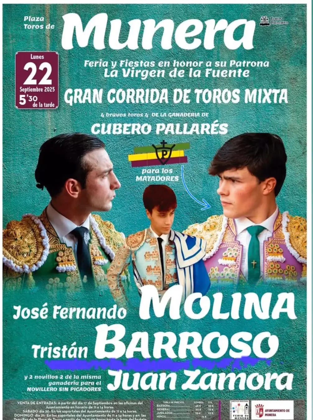Una corrida mixta en la que harán el paseíllo Jisé Fernando Molina y Tristan Barroso y el alumno de la escuela de tauromaquia de Albacete Juan Zamora. Los astados a lidiar pertenecen al hierro de Cubero Pallarés.