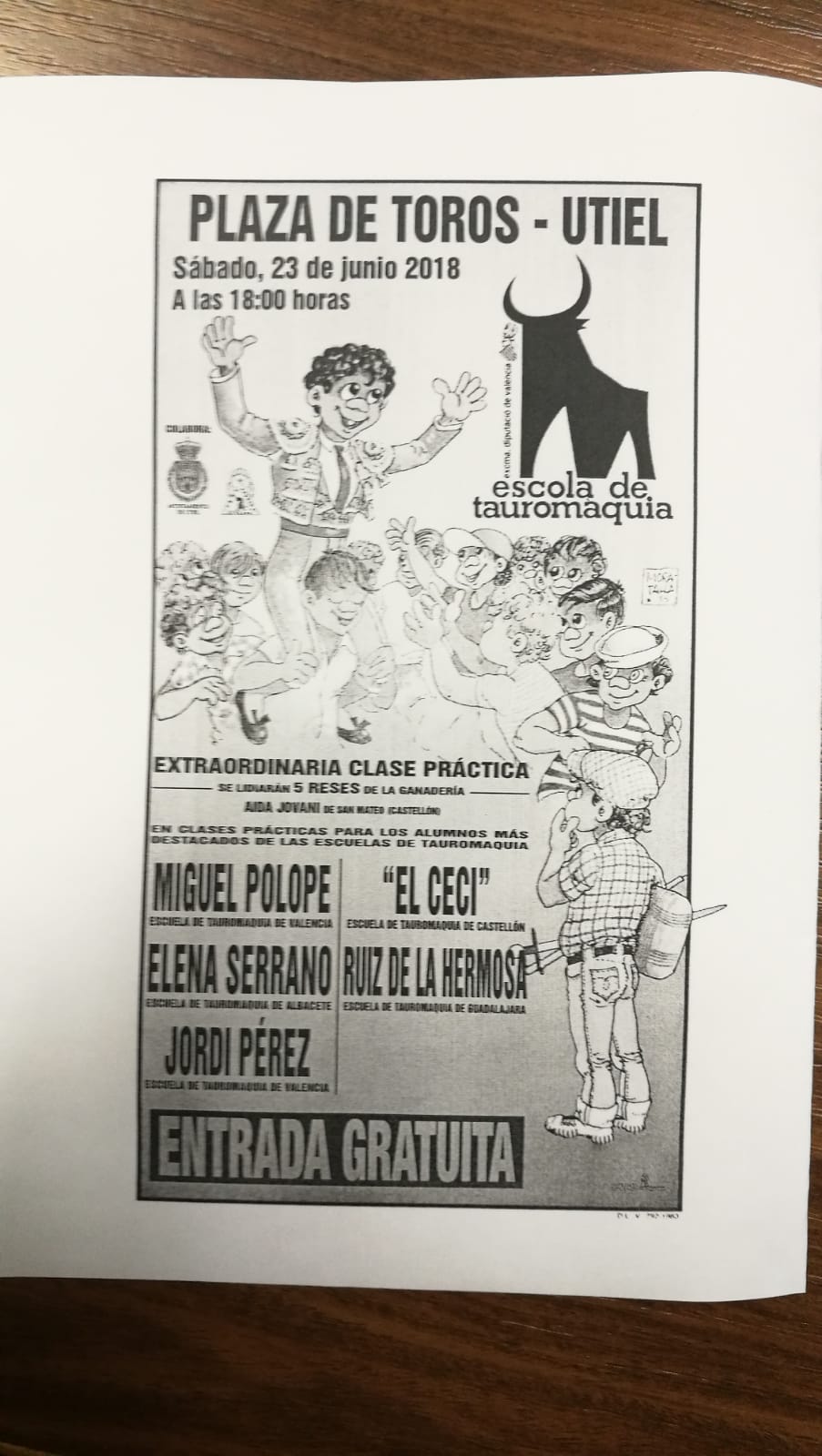 En la misma se van a lidiar reses de la ganadera castellonense Aída Jovani. El quinteto de actuantes, está integrado por los valencianos Miguel Polope y Jordi Pérez, la alumna de la escuela de tauromaquia de Albacete Elena Serrano, El Ceci de la escuela taurina de Castellón y Ruiz de la Hermosa, de la escuela taurina de Guadalajara.