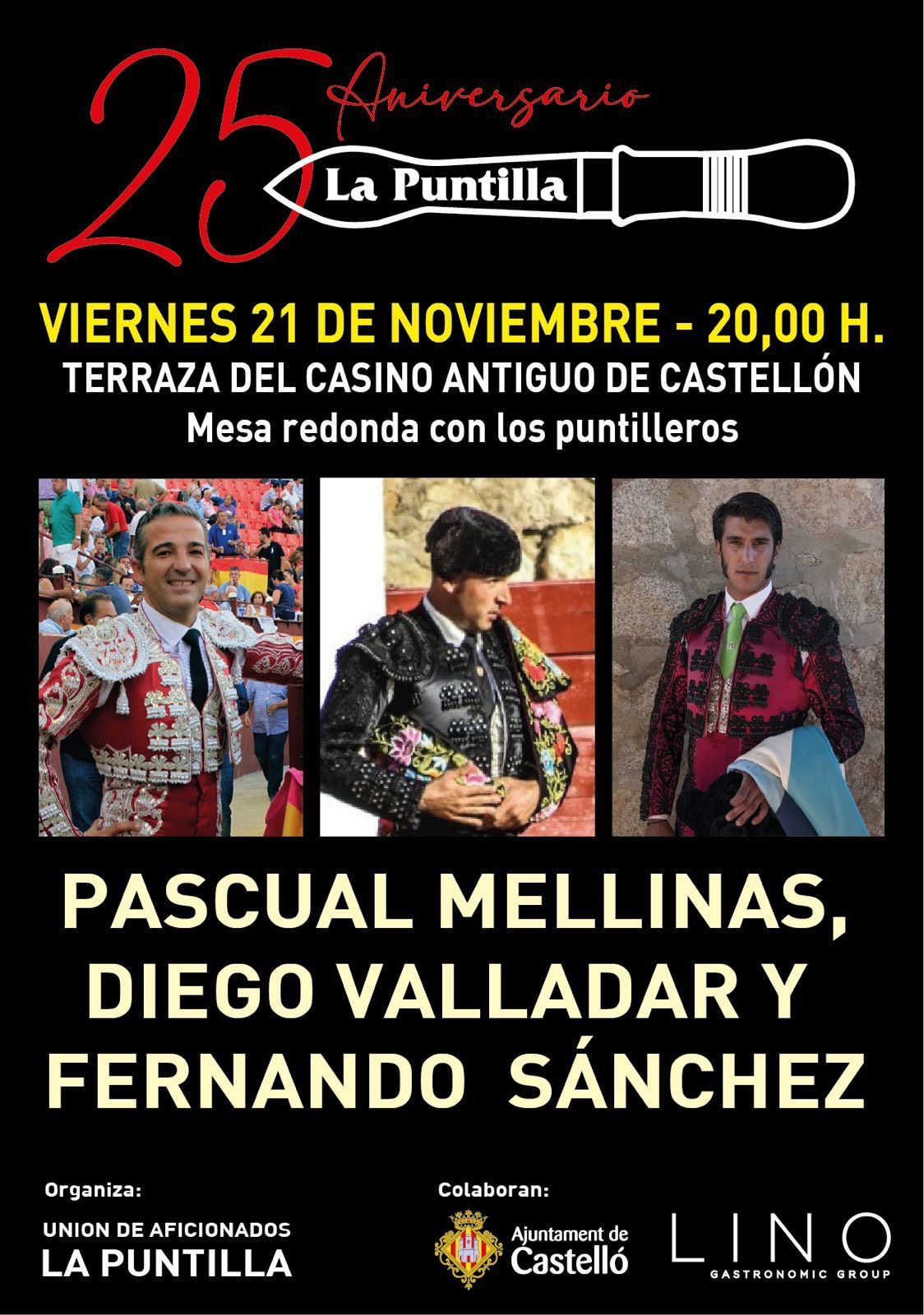El próximo viernes día 21 de noviembre, y dentro de los actos conmemorativos del 25 aniversario de la Unión de aficionados La Puntilla de Castellón, tendrá lugar una mesa redonda. En la misma tomarán parte tres hombres de plata que son además tres puntilleros de excepción: Pascual Mellinas, Diego Valladar y Fernando Sánchez.