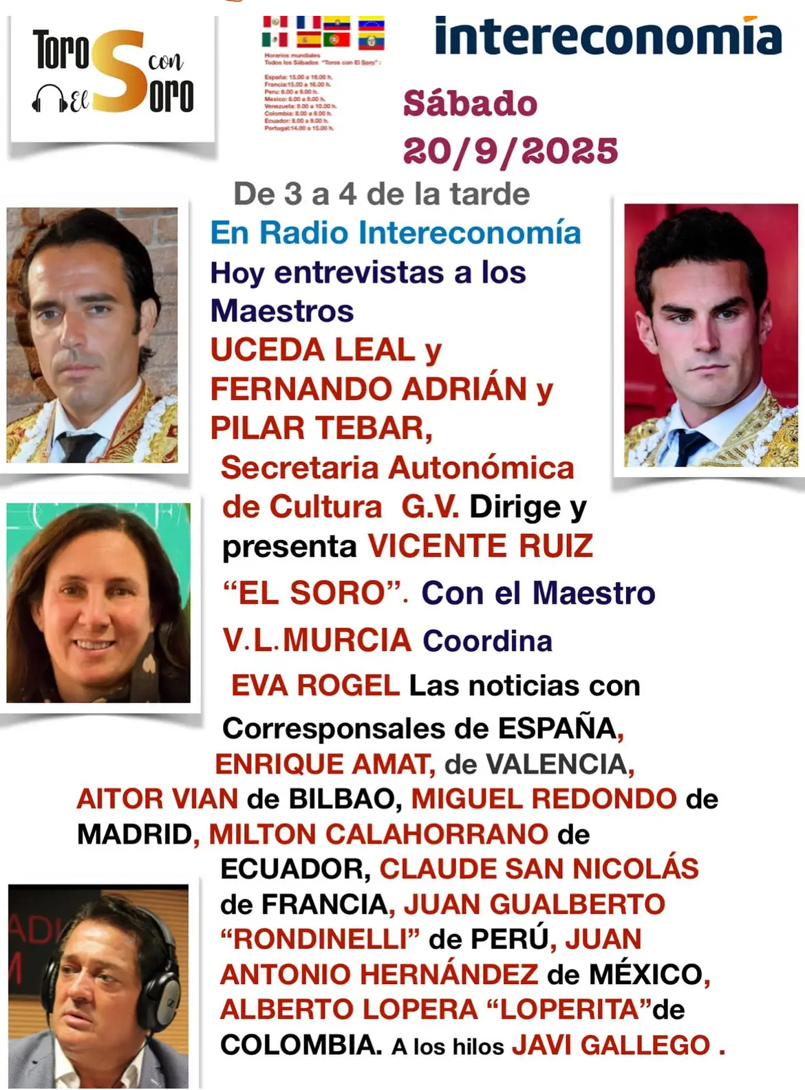 El programa “Toros con el Soro” de Radio Intereconomía se emite hoy sábado 21 de septiembre de 2025 de 3 a 4 de la tarde.
