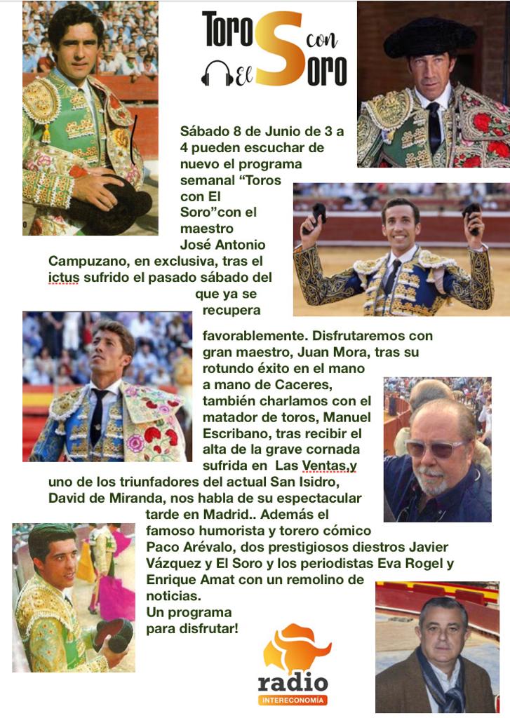 El programa TOROS CON EL SORO de Radio Intereconomía, que dirige Vicente Ruiz el Soro junto con Eva Rogel, se puede escuchar esta tarde de sabado a partir de las 15.00 horas.
