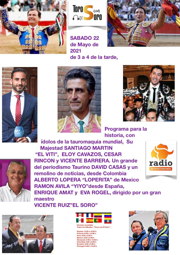 El programa “Toros con el Soro”, que se emite en Radio Intereconomía mañana sábado día 22 de mayo de 2021 de 15:00 a 16:00 horas, y que dirige Vicente Ruiz El Soro junto con Eva Rogel, va a tener un más que interesante contenido con un cartel de lujo.