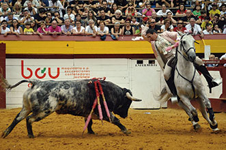 Y menos mal que actuó Ana Rita, porque de lo contrario se hubiese padecido otra tarde sin contenido. La portuguesa brindó la lidia del novillo de rejones al monosabio valiente en medio de una gran ovación que reconoció su valor y profesionalidad. Fue este utrero un animal feo y grandón que embestía con codicia y echando la cara arriba, y al que la rejoneadora lusa aguantó bravamente y dio adecuada réplica, mostrando una monta excepcional y un notable sentido de la lidia, dejando llegar mucho y llevando a su oponente pegado a sus estribos. Hizo las suertes con mucha pureza, clavando siempre arriba y muy reunido, entusiasmando con sus levadas, cabriolas y adornos antes de matar de un certero rejonazo. Dos orejas y petición de rabo que finalmente se concede. El delirio. Y otro rejoneador que les gana la partida a los novilleros.