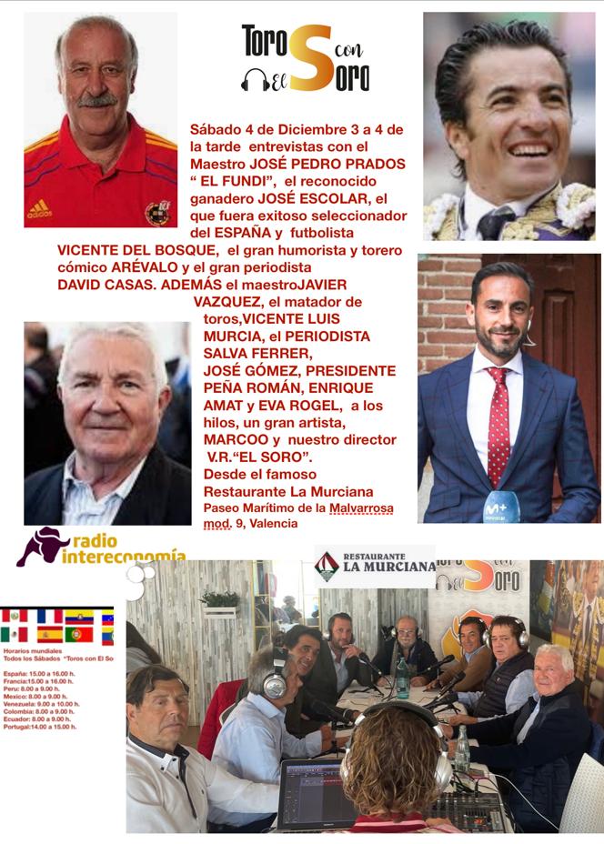El programa “Toros con el Soro”, de Radio Intereconomía, que se emite mañana 4 de diciembre de 15.00 a 16.00 horas, tiene un más que abundante contenido y se emite desde el restaurante la Murciana de Valencia.
