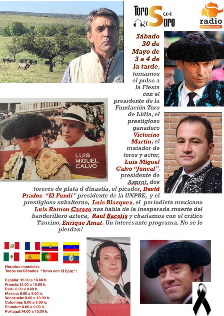 En esta ocasión, se tratará de analizar el pulso de la fiesta y la situación que se está viviendo ante la actitud del Ministerio de Cultura y el tema de la Seguridad Social de los toreros y sus prestaciones por desempleo. Tomará parte en el mismo el ganadero Victorino Martín, quien a su vez es presidente de la Fundación del Toro de Lidia. Asimismo se contactará con Luis Miguel Calvo “Juncal”, matador de toros, banderillero y actor, y en la actualidad presidente de Asprot. También se contactará con los hombres de plata David Prados, presidente de UNBPE y el valenciano Luis Blázquez.