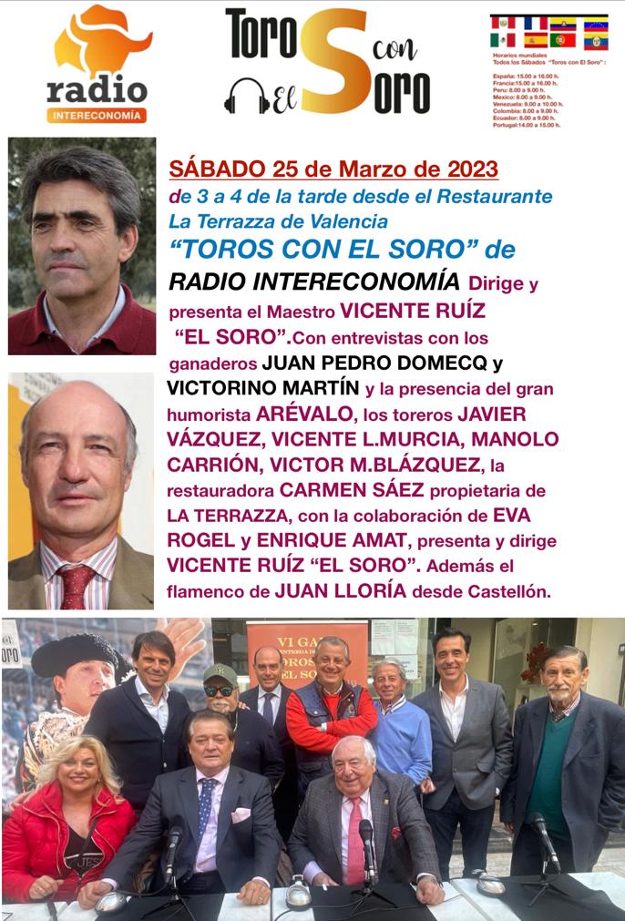 El programa “Toros con el Soro”, de Radio Intereconomía se emite hoy 25 de marzo de 2023 de 15.00 a 16.00 horas desde el restaurante La Terrazza sito en la calle San Vicente de Valencia.