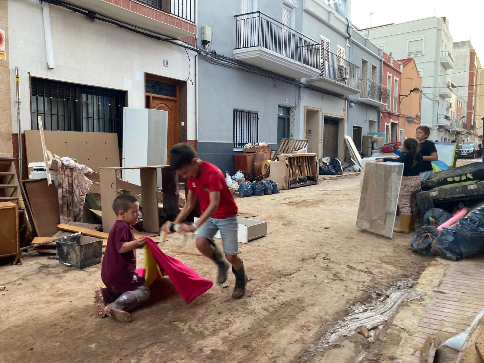En los pueblos valencianos afectados por la DANA hay muerte, dolor, incredulidad, incomprensión, impotencia, incapacidad, solidaridad, gratitud, desesperación, cansancio, confusión, angustia, desconsuelo y también toreo. En medio de una calle embarrada de Algemesí, rodeados de coches, muebles y electrodomésticos devastados por el agua que envió una riada asesina, amparados por la inocencia infantil, dos niños juegan a toros ajenos al drama que les rodea.